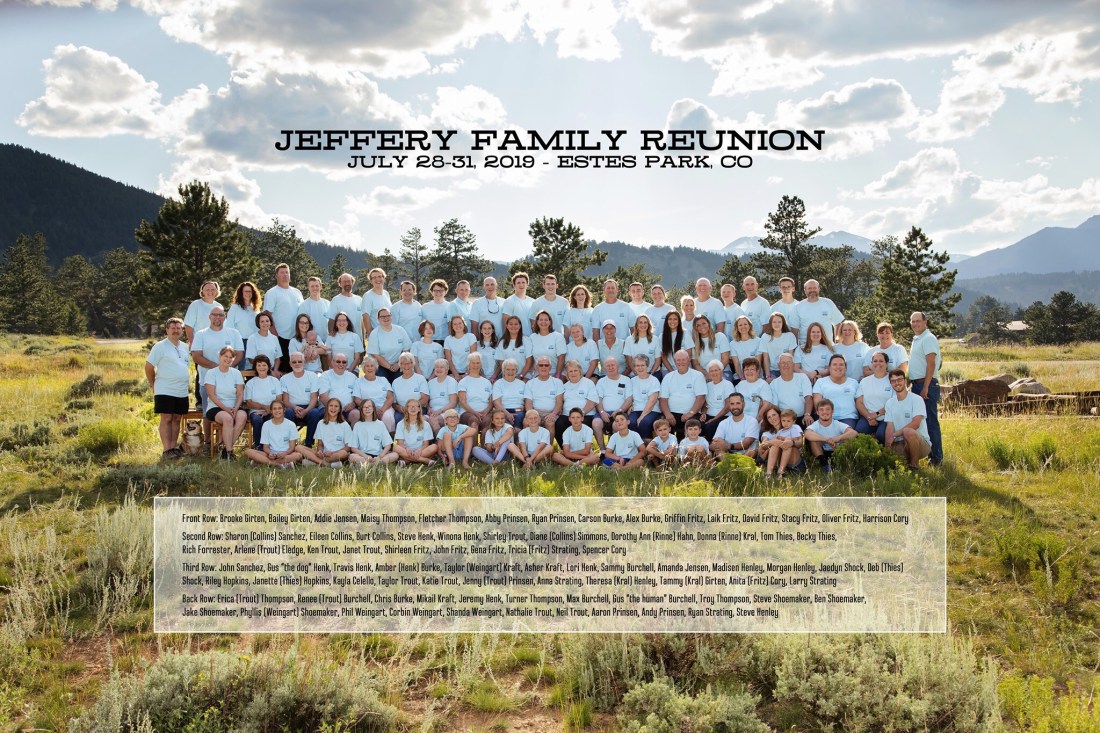 The first official Jeffery reunion was held on the grounds of Crab Orchard’s Methodist Church. Reunions were held every two years until 9 years ago when it was decided thereafter reunions would be held every three years. When family numbers tripled exponentially, the necessity of meeting at a place catering to reunions convinced us to hold every subsequent reunion at YMCA of the Rockies outside of Estes Park, Colorado, near Rocky Mountain National Park, and where large reunion lodges can be rented and different age groups can choose from many activities.